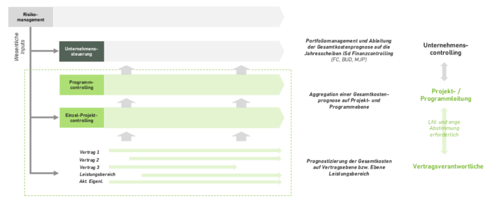Die Struktur von Infrastrukturprojekten ist meist durch eine Vielzahl von Auftragnehmern und komplexen Vertragsbeziehungen (mit teilweise sehr unterschiedlichen Auftragssummen) gekennzeichnet, die transparent abgebildet werden müssen die unterste Ebene der Steuerung bilden. Das Projektcontrolling basiert daher auf der systematischen Erfassung und Aggregation von Daten aus Verträgen oder noch nicht vergebenen Leistungsbereichen. Prognosen zu Kosten und Terminen auf dieser Ebene werden zusammengeführt, um ein transparentes Gesamtbild auf Projektebene zu aggregieren. Für Bauherren mit mehreren parallel laufenden Projekten ist zusätzlich eine unternehmens- oder konzernübergreifende Betrachtung notwendig, um wirksame Steuerungsimpulse für die Management ebene abzuleiten. Diese spezifische Struktur ist bei der Ausgestaltung des Controllings zu berücksichtigen und stellt in der Regel einen entsprechenden Komplexitätstreiber dar. Abbildung 1 zeigt exemplarisch die unterschiedlichen Ebenen und deren wesentliche Zusammenhänge.