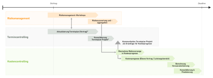Im Rahmen regelmäßiger Planungs- und Prognosezyklen dienen sowohl das Risikomanagement als auch das Termincontrolling als Basis für die Aktualisierung der Kostenprognosen. Erkenntnisse aus Risiko-Workshops fließen direkt in die Terminpläne und die Risikovorsorge ein. Auf dieser Grundlage erfolgt eine konsolidierte Aktualisierung der Projektterminpläne, die wiederum als Fundament für das laufende Kostencontrolling dient. Dies stellt die Berücksichtigung terminbedingter Kostenentwicklungen sicher.