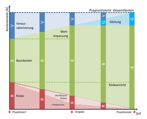 Die Kostenbestandteile werden zum Teil auf Ebene der Verträge bzw Leistungsbereiche (Basiskosten inkl Wertanpassung und Gleitung) und zum Teil auf Ebene der Projekte (Risikovorsorge und Vorausvalorisierung) verfolgt und prognostiziert bzw ermittelt. Die Summe aus den Kostenbestandteilen BGRV gibt die Gesamtkostenprognose für das Projekt wieder. Hierzu erfordert es klare Definitionen und Regeln für die Anwendung. Zudem zeigt sich, dass das Denken in Kostenbestandteile auch einen entsprechenden Change- und Kommunikationsaufwand mit sich bringt, der in der Umsetzung nicht unterschätzt werden darf, um in der Organisation wirksam zu werden. Hinzu kommt, dass die oben dargestellte Art der Kostenverfolgung auch entsprechende Anforderungen an ein Tool stellt und dort als unabdingbares Gestaltungsmerkmal vorzusehen ist.